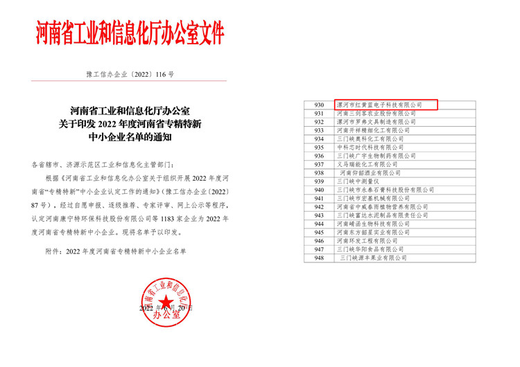 熱烈祝賀漯河市紅黃藍(lán)電子科技有限公司榮獲“2022年度河南省“專精特新”中小企業(yè)認(rèn)定。